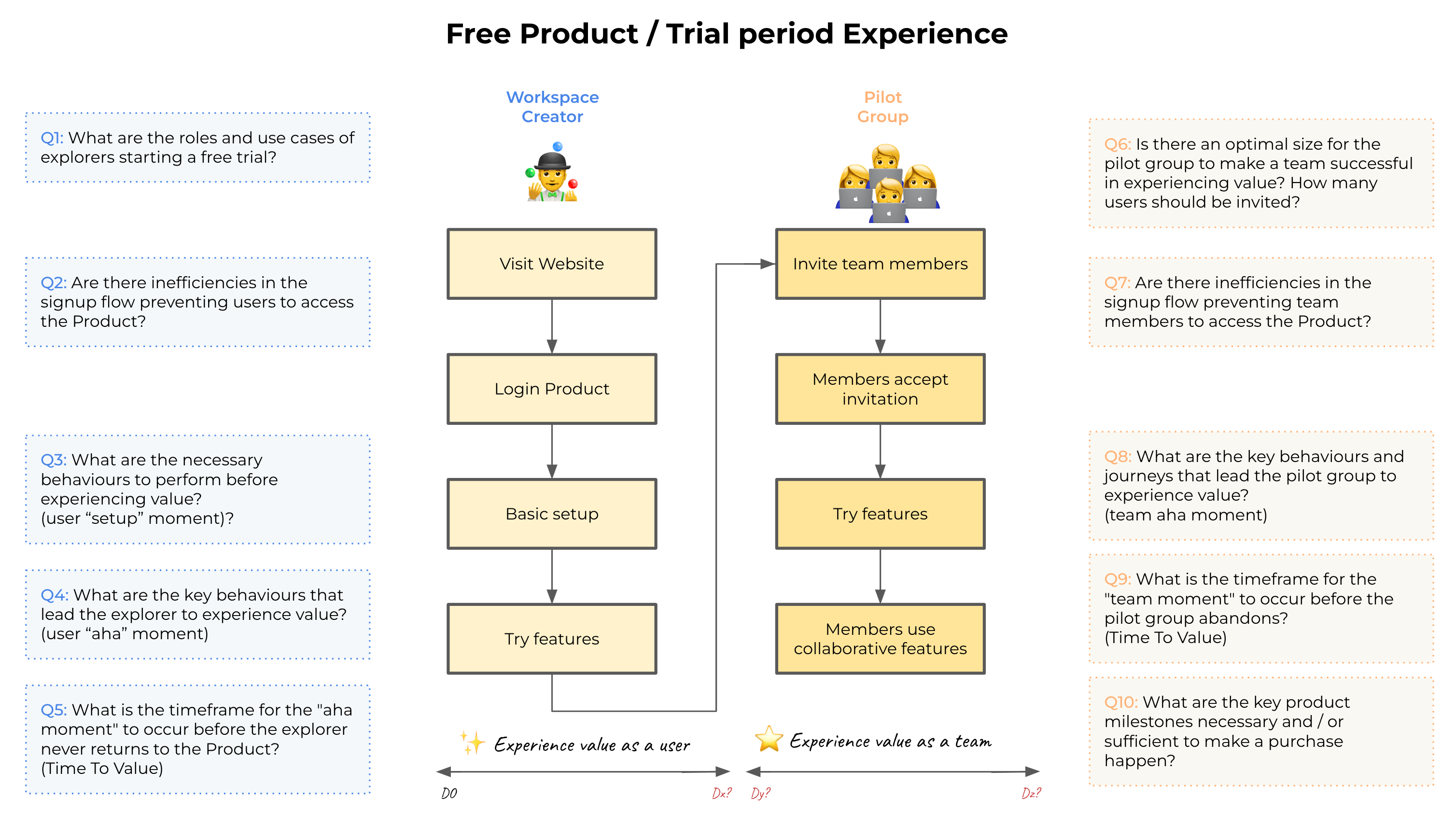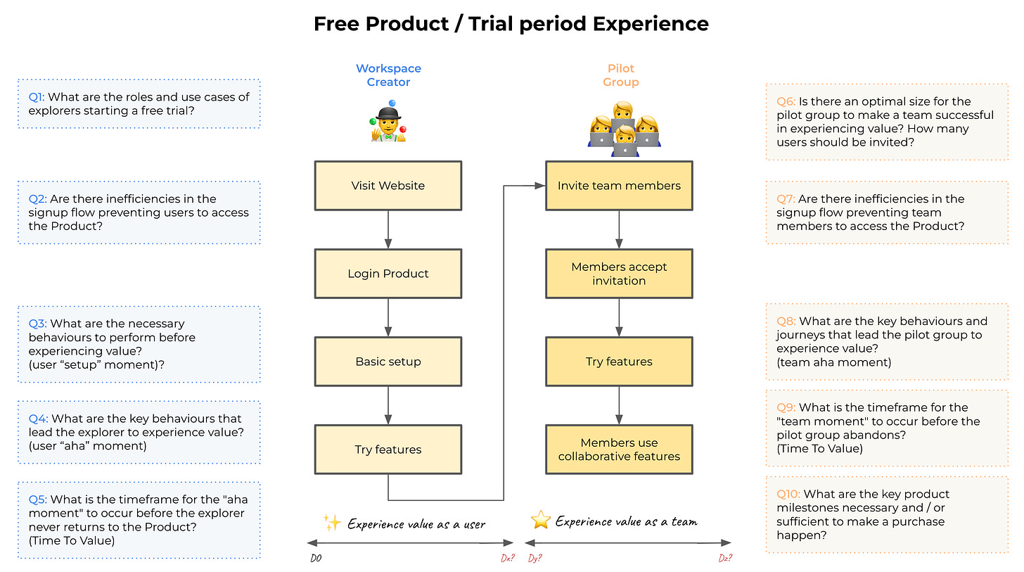 Looking at the first section of the journey (involving the workspace creator and the pilot group), we can identify several key milestones for which we will need to create customised metric definitions for Miro: