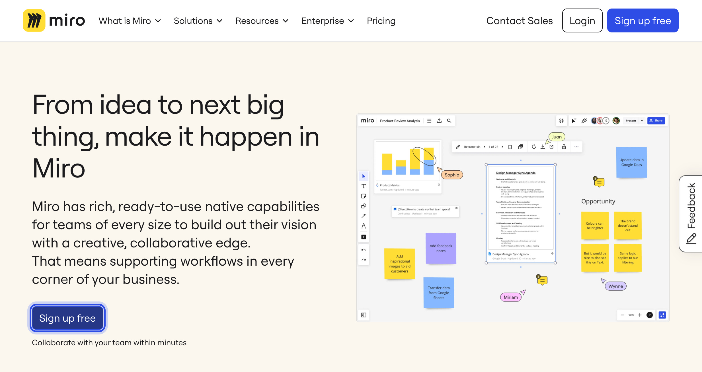 Miro is an online collaborative whiteboard platform that enables teams to ideate, brainstorm, and collaborate visually in real-time. It offers a digital canvas where users can create and share diagrams, mind maps, wireframes, sticky notes, and more.
