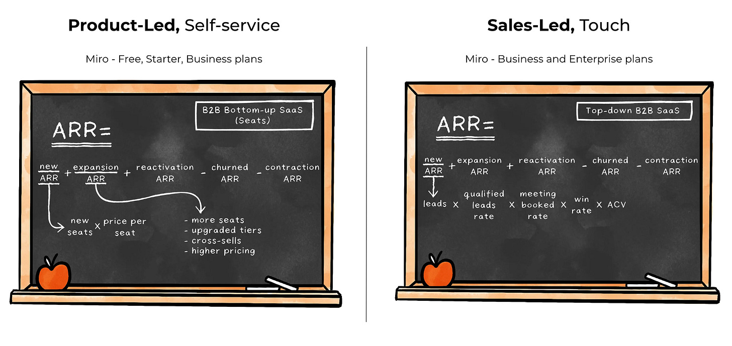 Similarly as other B2B Businesses with recurring revenue, Miro falls under the bowtie model, popularised by Winning by Design. The total revenue generated is composed of two funnels, a process to sell (new $ARR) and a process to retain/expand (repeat $ARR).