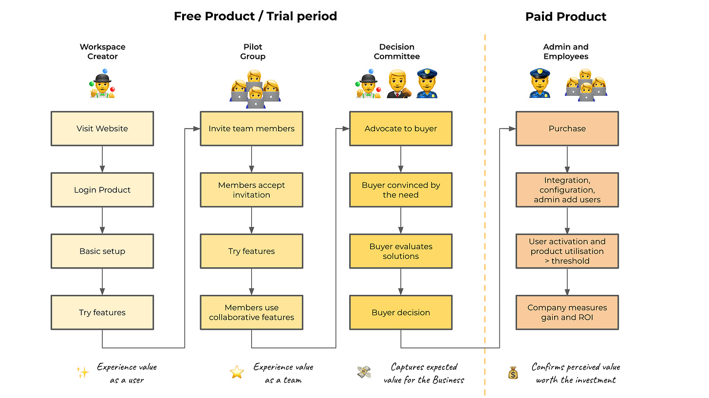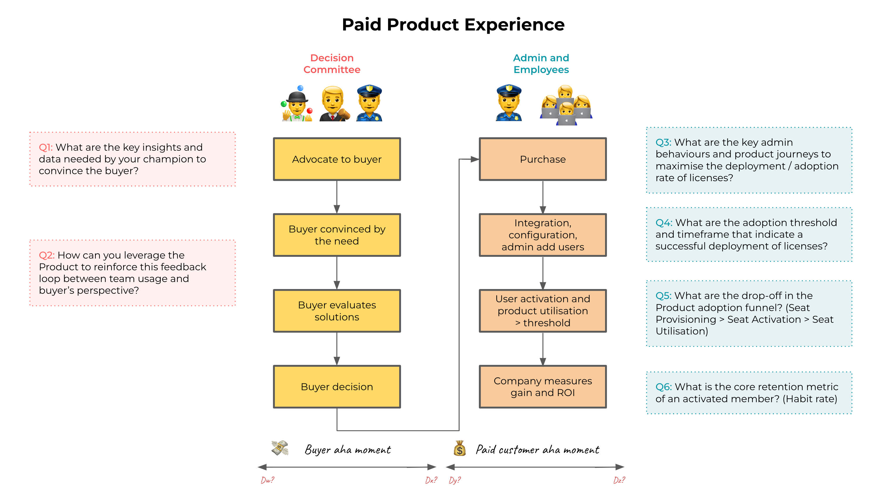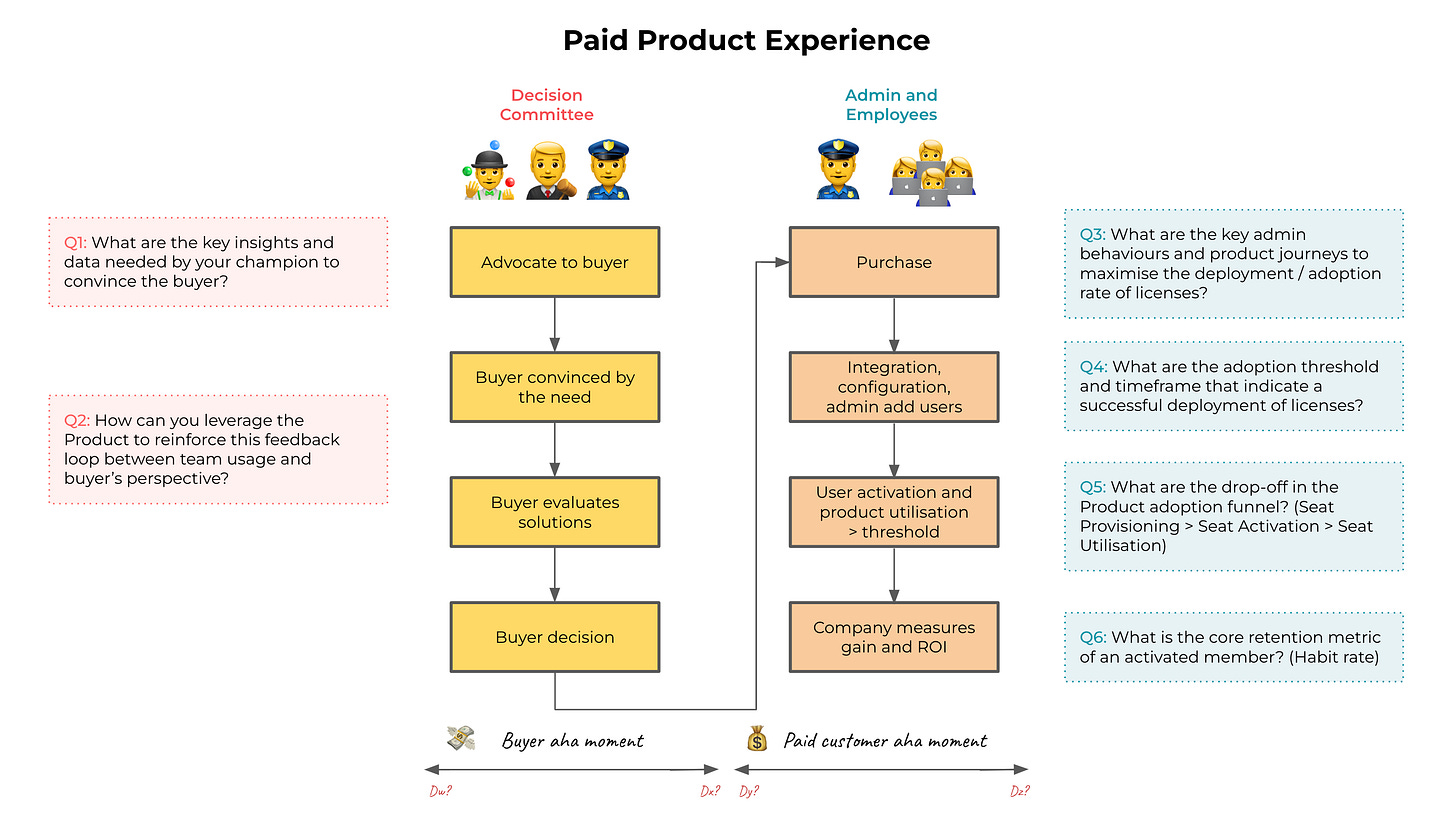 We won't dive further into the buyer's "aha moment" process since interactions within the decision committee typically occur offline or outside of the product, making advanced product analysis less relevant.